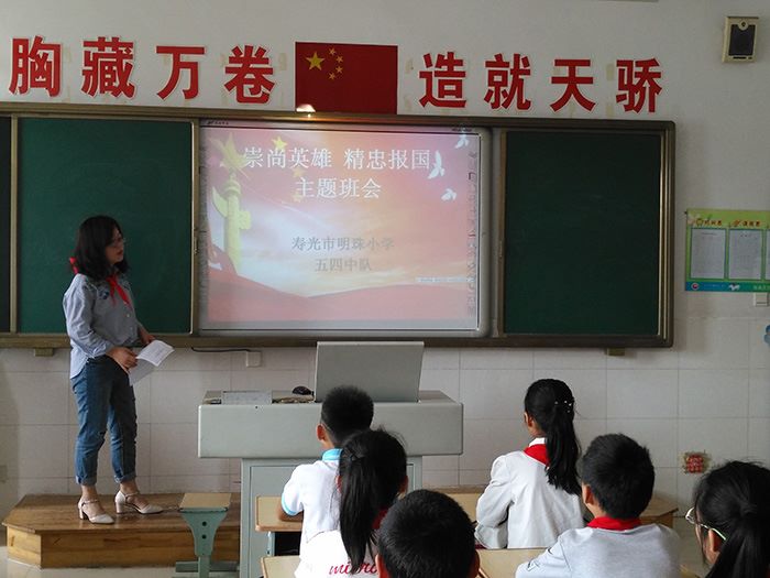 为深入学习贯彻习近平新时代中国特色社会主义思想和党的十九大精神,贯彻落实《中华人民共和国英雄烈士保护法》,传承和弘扬英雄烈士精神、爱国主义精神,深入培育和践行社会主义核心价值观,在队员中营造“崇尚英雄、精忠报国”的浓厚氛围。日前,市明珠小学党支部部组织各中队开展了“崇尚英雄精忠报国”主题教育活动。主题队会上,各中队组织队员收看《崇尚英雄 精忠报国》宣传片,解读英雄内涵,揭示英雄就在身边,引发队员对英雄的崇敬,对英雄精神的思考。