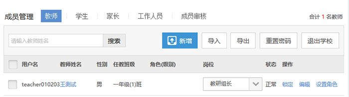 4.成员管理。左侧导航菜单的“成员管理”—“教师”或“学生”,分别进入相应的管理模块。如果是查漏补缺,请逐个添加成员,如果是大量数据,请使用“导入”。