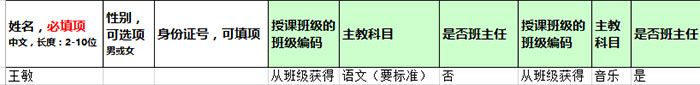 接下来是模版的应用方法,以教师为例。下表中需要填写四项,分别是“姓名”、“授课班级的班级编码”、“主教科目”、“是否班主任”;其中“姓名”填写真实姓