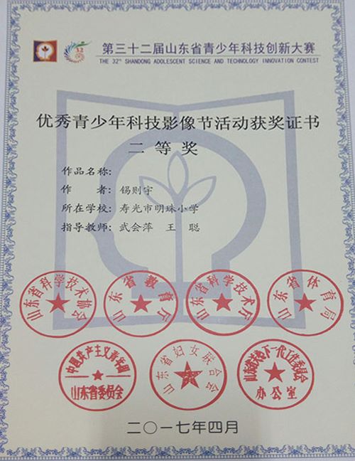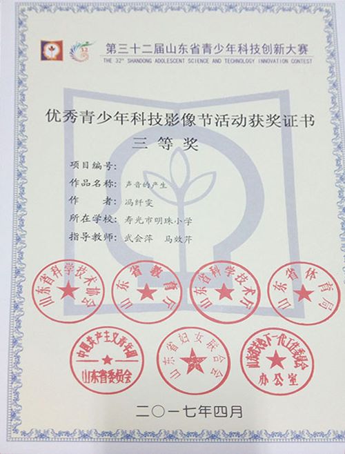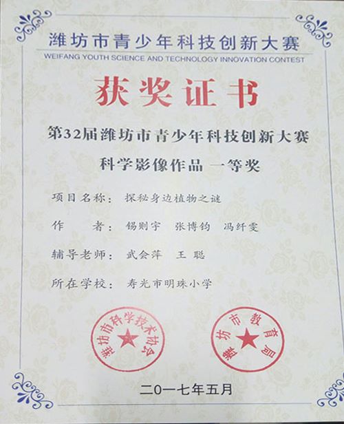 其中,由隋玉芹,张辉老师等参与辅导的科技实践活动《认识身边的植物》获得第32届潍坊市青少年科技创新大赛科技实践活动类一等奖、山东省科技创新大赛实践活动类三等奖。由武会萍和王聪老师指导的科学影像《探秘身边的植物之谜》获得潍坊市青少年科技创新大赛科学影像类一等奖、山东省科技创新大赛科学影像类二等奖。由武会萍、马效芹老师指导的影像类《声音的产生》获得潍坊市一等奖、山东省科学影像类三等奖。