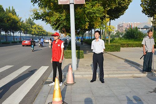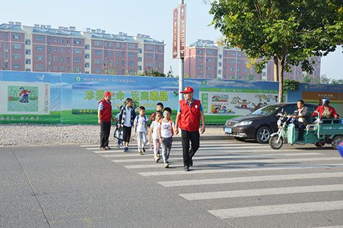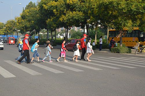 9月12日清晨,一群身穿红马甲,头戴小红帽的志愿者出现在明珠小学门口,他们都是学校可爱的老师们。学校校长郭建富亲自带领志愿者们上街疏导交通,劝导乱停乱放车辆,帮助小学生过马路,校门口前面的街道变得井然有序起来。