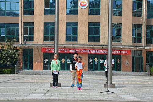 伴随着庄严的国歌声,五星红旗冉冉升起,全体师生肃立注目,开学典礼正式拉开序幕。学校1000余名师生整齐列队,李华副校长首先致辞,表达了对一年级新生的欢迎并希望他们在明珠小学的大家庭里认真学知识、努力讲文明,健康快乐地成长;低年级级部高主任向学生们提出恳切要求,严格遵守学校规章制度,讲文明,懂礼貌,尽快以最佳状态投入到新学期紧张的学习生活当中去,争做优秀好少年;学生代表作了热情洋溢的国旗下讲话,号召全体同学以新学期为起点,以饱满的精神和坚定的信心来迎接新学期挑战,立志成为一名优秀的小学生。