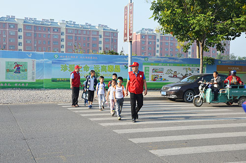9月12日清晨,一群身穿红马甲,头戴小红帽的志愿者出现在明珠小学门口,他们都是学校可爱的老师们。学校校长郭建富亲自带领志愿者们上街疏导交通,劝导乱停乱放车辆,帮助小学生过马路,校门口前面的街道变得井然有序起来。