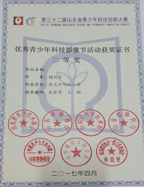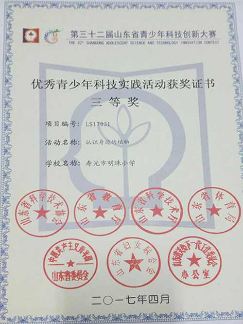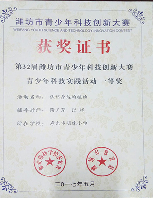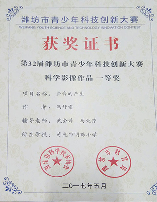 其中,由隋玉芹,张辉老师等参与辅导的科技实践活动《认识身边的植物》获得第32届潍坊市青少年科技创新大赛科技实践活动类一等奖、山东省科技创新大赛实践活动类三等奖。由武会萍和王聪老师指导的科学影像《探秘身边的植物之谜》获得潍坊市青少年科技创新大赛科学影像类一等奖、山东省科技创新大赛科学影像类二等奖。由武会萍、马效芹老师指导的影像类《声音的产生》获得潍坊市一等奖、山东省科学影像类三等奖。