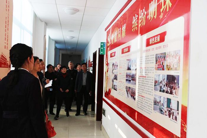 考察团在刘美娟同志的带领解说下,参观了学校的“永远跟党走”主题文化长廊,充分感受到了明珠小学“党徽闪耀缤纷明珠”的特色党建文化。